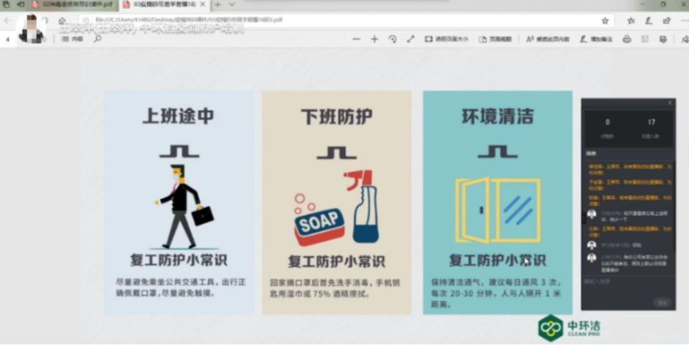 中環潔總部及投(tóu)資企業管(guǎn)理者在疫情發生後多采用視頻會議、電話會(huì)議等在線辦公方式,線上傳達落(luò)實相關防疫管理工作。信息管理中心利用(yòng)釘釘酷學院、全時(shí)會議係統等,開展防疫(yì)知識、疫情發展狀況、作業安全手段等在線培訓。